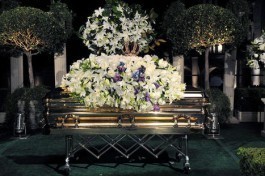 Der goldene Sarg ist geschmückt mit weißen Lilien.