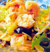 Das Öl im Wok sehr heiß werden lassen, die Zwiebeln, die Karotten, die Frühlingszwiebeln, den Staudensellerie, die Bambus- und Sojasprossen, die Champignons und die Pilze hineingeben und 2 Minuten pfannenrühren. Mit der Brühe aufgießen, die Glasnudeln zugeben und 2 Minuten pfannenrühren, dann das Fleisch zugeben. Die Sojasauce, den Zucker, die in Sherry angerührte Speisestärke zufügen und unter Rühren aufkochen lassen, bis die Sauce sämig ist. Mit Salz und Pfeffer abschmecken und in einer vorgewärmten Schüssel servieren.
